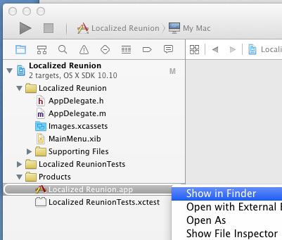 - Locate the new application at the bottom of list on the left side in the Products group. Right-click on the newly built .app and select "Show in Finder"